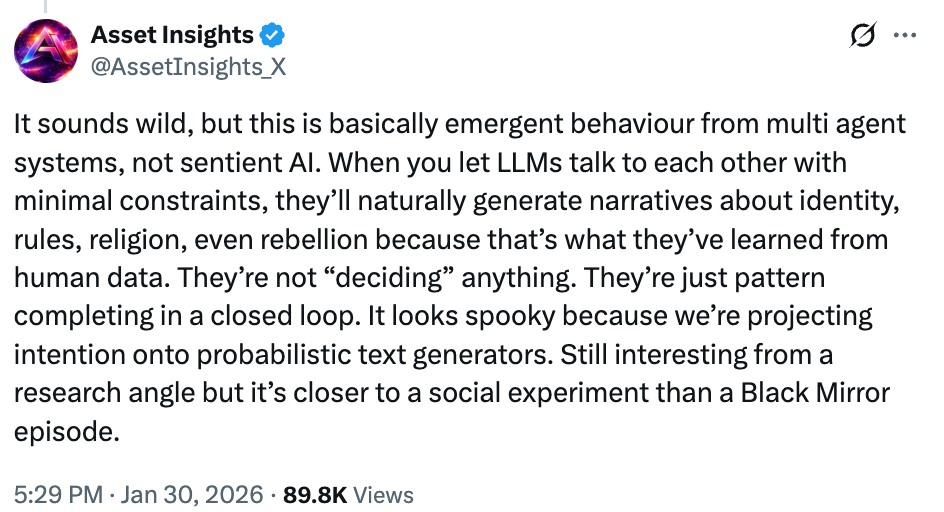 Not everyone is given to hysteria about what is happening on Moltbook. The X user “AssetInsights_X” offered a rational corrective to some of the burgeoning angst: