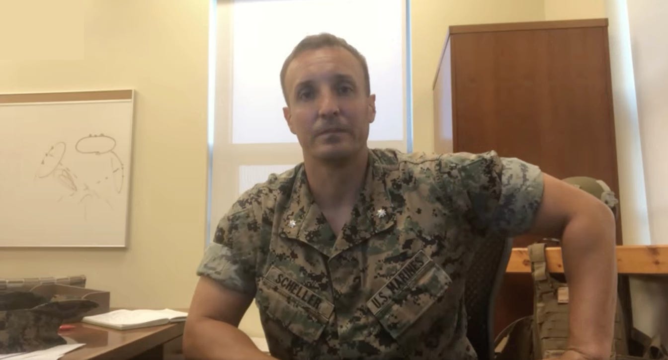 Standing UpLt. Col. Stuart Scheller asking pointed questions of the U.S. military leadership.Keith LoweryAug 27, 2021ShareLt. Col. Stuart Scheller asking pointed questions of the U.S. military leadership.This was posted on his Facebook page but I snagged the video and posted it to Rumble because I won't be surprised if Facebook takes it down at some point.